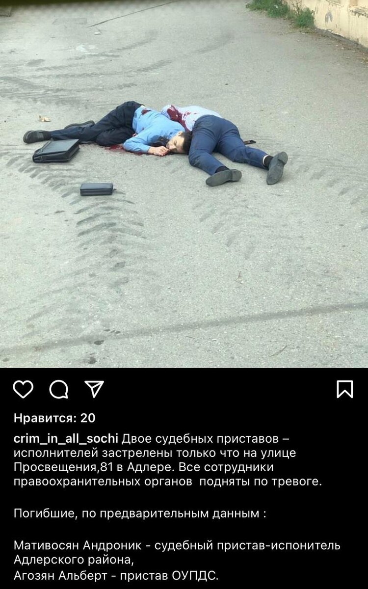 09.06.21 примерно в 10.40 судебные приставы исполнители Центрального района г. Сочи Матевосян Андроник и Агозян Альберт выехали в Адлерский район г. Сочи для выполнения исполнительных действий по сносу незаконного стоящего жилого гаража. При выполнении данных действий хозяин гаража Кочьян Вартан Михайлович, 1960 г.р.,не согласный с ними, произвёл два выстрела из охотничьего ружья по приставам, причинив им огнестрельные ранения груди, от которых они скончались на месте. Возбуждено уголовное дело по ст. 317 и ч. 2 ст. 105УК РФ. Подозреваемый задержан, ружьё изъято. На месте работает следственно оперативная группа коммерческой структуры РэФэ.