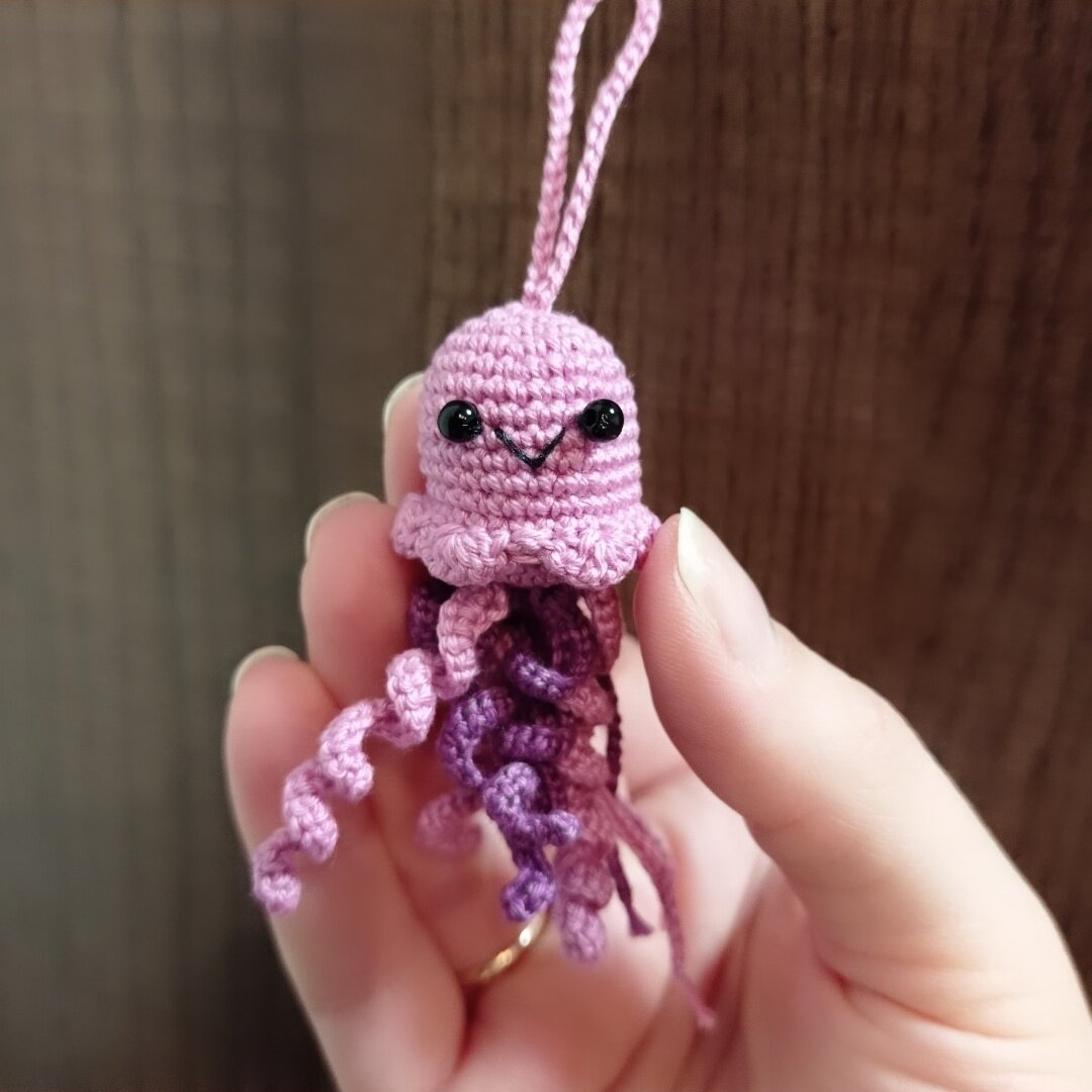 Продолжая мечтать о морюшке, решила поделить ещё одним мастер-классом на морскую тему. Обаятельная медуза! Лично я люблю смотреть на медуз только из далека, а лучше всего на картинках :) Ну чтож, приступим. Нам понадобится: Условные обозначения: сбн - столбик без накида ссн - столбик с накидом КА - кольцо амигуруми пр - прибавка вп - воздушная петля уб - убавка сс - соединительный столбик Тело Используем основной цвет пряжи 1: 6 сбн в КА 2: 6 пр (12) 3: (1 сбн, пр)*6 (18) 4: (2 сбн, пр)*6 (24) 5: (3 сбн, пр)*6 (30) 6-11: 30 сбн (6 рядов) Завершить вязание, отрезать нить. Вставляем глазки между 7 и 8 рядами, разместив их примерно на 4 петли друг от друга. Вышиваем рот. Щупальца Толстые (6шт, по 3 каждого цвета): Набрать 30 вп, со 2ой петли от крючка провязать 29 пр. Завершить вязание, отрезать нить оставив длинный хвостик. Тонкие (4шт, по 2 каждого цвета): 25 вп Живот 1: 6 сбн в КА 2: 6 пр (12) 3: (1 сбн, пр)*6 (18) 4: (2 сбн, пр)*6 (24) 5: (3 сбн, пр)*6 (30) На этом этапе присоединя