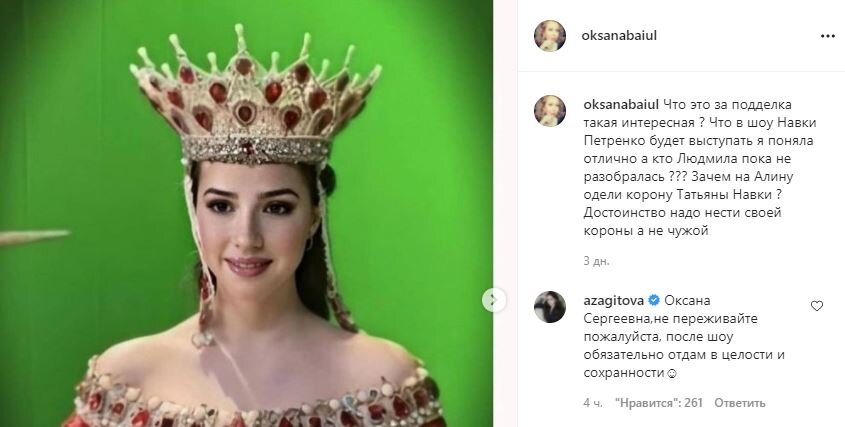 Оксана Баюл нашла золотую жилу – можно целыми днями ничего не делать, а просто критиковать в своем инстаграме Этери Тутберидзе и всех, кто с ней связан и ловить на этом хайп и надеяться на то, что кто-то вспомнит про забытую чемпионку из 90-х. Начала Баюл с шоу Этери Тутберидзе «Чемпионы на льду», а теперь вот добралась до шоу олимпийской чемпионки Татьяны Навки. Черный пиар, это тоже пиар и высказывания Баюл еще сильнее подогреют интерес к ледовому шоу «Руслан и Людмила», в котором примет участие еще одна олимпийская чемпионка Алина Загитова. Что это за подделка такая интересная ? Что в шоу Навки Петренко будет выступать я поняла отлично а кто Людмила пока не разобралась ??? Зачем на Алину одели корону Татьяны Навки ? Достоинство надо нести своей короны а не чужой Спустя 3 дня Оксане Баюл последовал ответ от Алины Загитовой. Не исключаю возможности того, что возможно Алину Загитову попросили ответить на хамство Баюл. Любой пост Алины в инстаграме активно обсуждается ее многочисленными