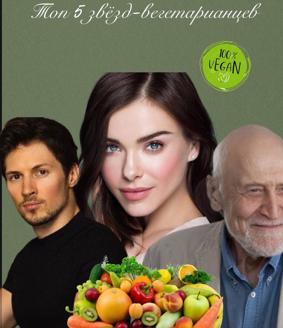 Добрый день!Сейчас вегетарианство становится нормой жизни для всё большего количества людей.Они приходят к вегетарианству по различным убеждениям.Но основная задача вегетарианства-здоровый образ жизни и защита животных. 1)Николай Дроздов В связи с этим просто невозможно не упомянуть такого известного человека как Николай Дроздов. Николай Дроздов – замечательный ведущий,учёный и просто добрый человек. Он увлекается йогой и очень любит животных.Поэтому по своим убеждениям он отказался от животной пищи и прекрасно себя чувствует. 2)Лайма Вайкуле Ещё одна приверженка вегетарианства с детства-Лайма Вайкуле,красивая стройная женщина,которая прекрасно выглядит ещё и благодаря отсутствию вредных привычек. 3)Павел Дуров Ещё одна знаменитая личность,создатель соцсетей,миллионер-Павел Дуров,который решил отказаться вообще от всех продуктов,которые разрушают организм.Также он старается мотивировать окружающих. 4)Елена Темникова Прекрасная певица-Елена Темникова,тоже предпочитает растительную пищу