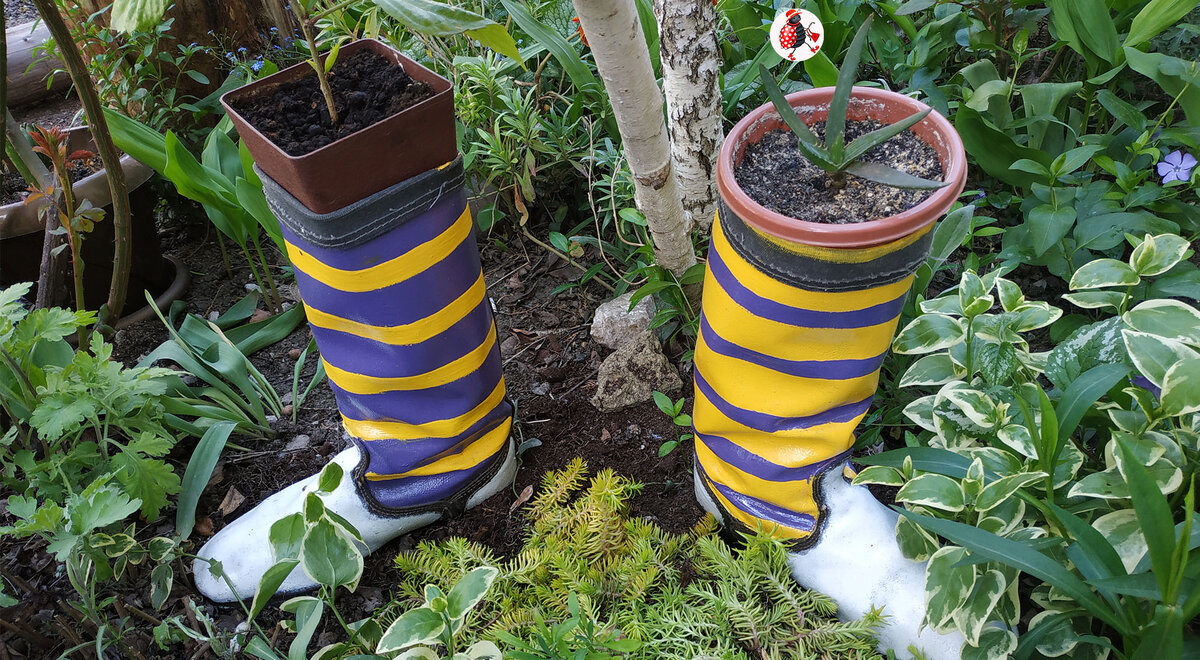 Все просто до оскомины в зубах – немного краски разных цветов, дырявые и негодные для носки сапоги и вот такое чудо может поселиться на вашем участке.