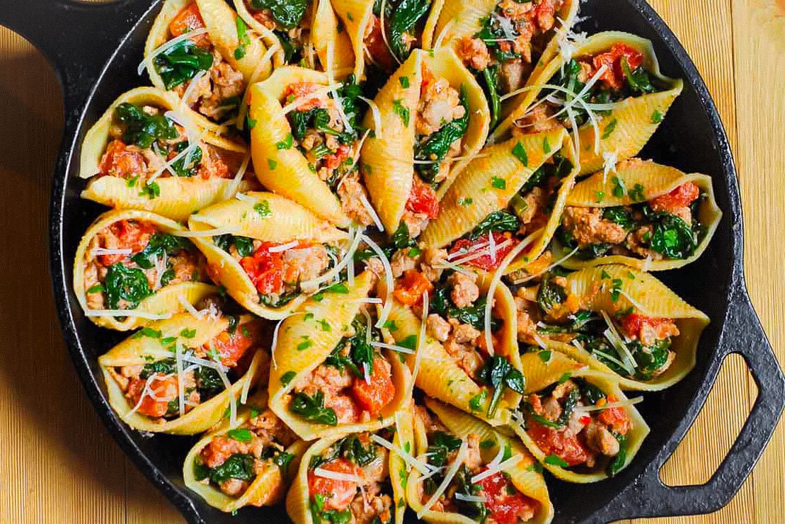 Начинка для макаронных оболочек сделана из свиной колбасы, шпината, помидоров и сыра рикотта. И ЧЕСНОК! И да, эти вкусные ингредиенты сочные, сырные и такие успокаивающие. Они также заставляют вашу кухню пахнуть потрясающе и заставляют вас хорошо выглядеть перед членами семьи.