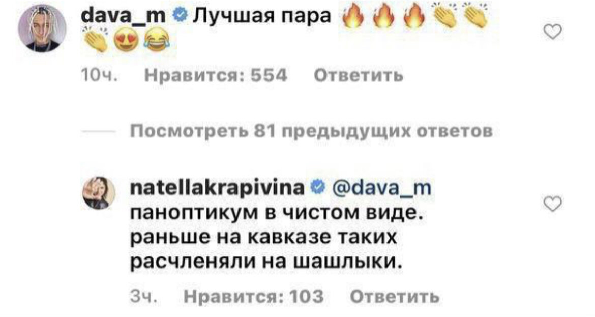Скандалы после премии Муз-ТВ не перестают утихать. Уже пару часов назад появился новый скандал, а дело в том, что продюсер Лободы решилась высказаться насчёт самой премии. Она назвала премию «цирк уродов», к тому же она прокомментировала образ Давы и Филиппа Киркорова: «Паноптикум в чистом виде. Раньше на Кавказе таких расчленяли на шашлыки» Реакция Киркорова не заставила себя ждать. Он написал гневный пост, в котором успел обвинить Лободу (которая тут вообще ни при чем) в плагиате номера на премии, успел обвинить Нателлу в дискриминации, гомофобии, трансфобии, назвал ее «прошлым веком». В конце Киркоров сказал следующую фразу — «Вы все еще ползаете, как гусеницы, и только судьба решит, раздавят вас или из вас получится бабочка» Также стало известно, что Zivert лайкнула тот самый комментарий Нателлы Крапивиной, об этом блогер Дава рассказал в своих сторис Что думаете насчёт данной ситуации? Пишите в комментариях!