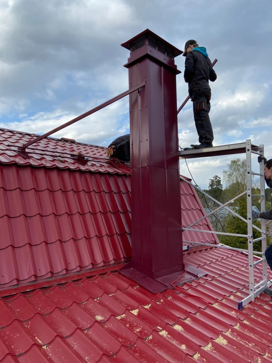 В этой статье под высоким дымоходом мы понимаем дымоход, у которого наружная “уличная” часть достаточно высокая. Домов с такими трубами достаточно много. Это когда часть здания находится не под основной крышей, а сделана в виде пристройки к дому. И дымовая труба выходит как раз из этой низкой части. Такие домики часто можно встретить в деревнях. Но и в современных проектах такие решения встречаются. Чтобы отопительная система нормально работала, а в дымоходе была тяга, трубу надо делать очень высокой. Иначе никак. Правило по высоте дымохода никто не отменял. При этом наружная часть трубы получается очень высокой. Например, вот этот объект. На этом фото уже готовый дымоход. Он не кажется таким высоким. Но посмотрите на него из другого положения. Здесь хорошо видно, насколько труба выше человека. Высота наружной части дымохода около 3 метров. Чем плох высокий дымоход? Этот дымоход мы хорошо утеплили и не переживаем за него, он прослужит много лет. Но гораздо лучше, если труба проходит вн