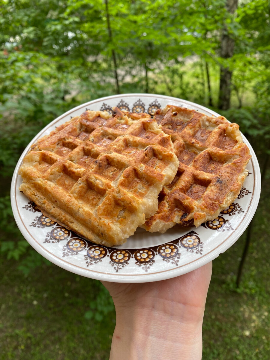 Идеальный вариант завтрака или перекуса! Хороши как в горячем, так и в холодном виде. Ну что, погнали готовить! Для приготовления нам потребуется: Яблоко очищаем от кожуры и натираем на крупной тёрке. Банан режем кусочками и затем разминаем вилкой. Добавляем творог, яйцо и всё хорошо перемешиваем. Затем понемногу всыпаем муку и снова перемешиваем до однородной консистенции. Банан и яблоко дают свою сладость, поэтому я не использую подсластитель. Но если вы сладкоежка, можете добавить сахар. Готовлю я все в мультипекаре, панели «венская вафля». Достаточно 10 минут. Приятного аппетита!