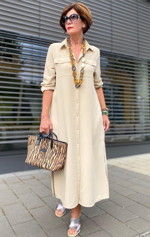 1. Платье-рубашка силуэта трапеция светло-бежевого цвета – прекрасный выбор для летних городских образов. Модель длиной до середины икры, сидит свободно, поэтому подойдет для фигуры любого типа. Дополнения образа – серебристые босоножки, сумка с принтом и стильное украшение.