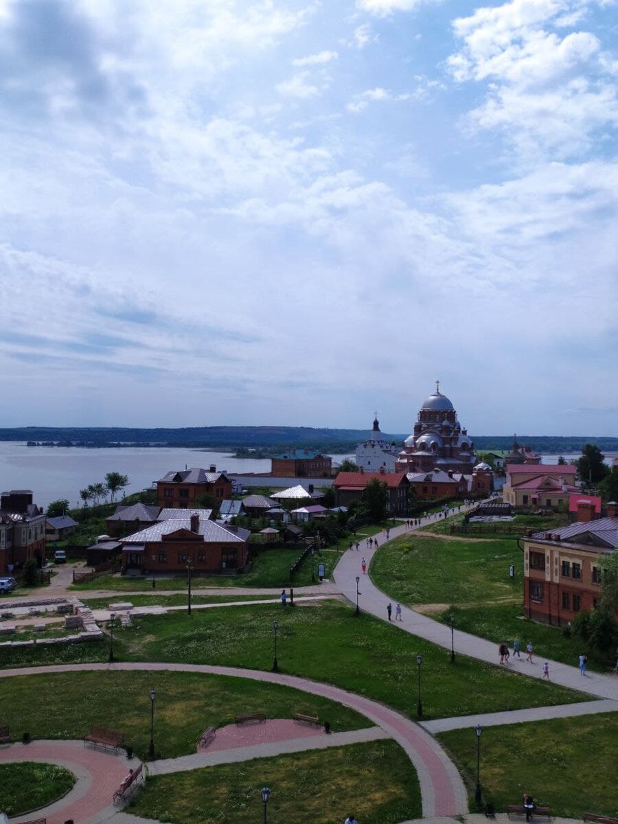 Я же тут буквально за неделю побывал в Свияжске два раза. Началось все с мероприятия «Ночь в музее Свияжск». Поехал на целый день, даже заночевал. А во второй раз - всего на три часа, но дорога была интересной. Мы с @kki_turizmiservice с группой 885 решили прокатиться до острова на речном трамвайчике из речпорта. Идет он до туда 2 часа, но время в хорошей компании проходит быстро и интересно. Некоторые спросят - а что там делать так часто и так по долгу? Прошёл остров взад-вперëд и всë. Но я вам скажу, езжу я туда с детства, и очень люблю это место, мне не хватает и целого дня! Это же надо зайти в Успенский собор и поздороваться со Святым Христофором. Добежать до Троицкой деревянной церкви, зайти в храм Всех Скорбящих Радость, там зайти в трапезную выпить киселя. Совсем рядом дядя Давид с тётей Кетино готовят хачапури. Дойти до Торжка, там посмотреть, как честной люд веселится, метают топоры в пеньки, дерутся на мешках, танцуют и поют. Нельзя пройти мимо красных девиц, которые гото