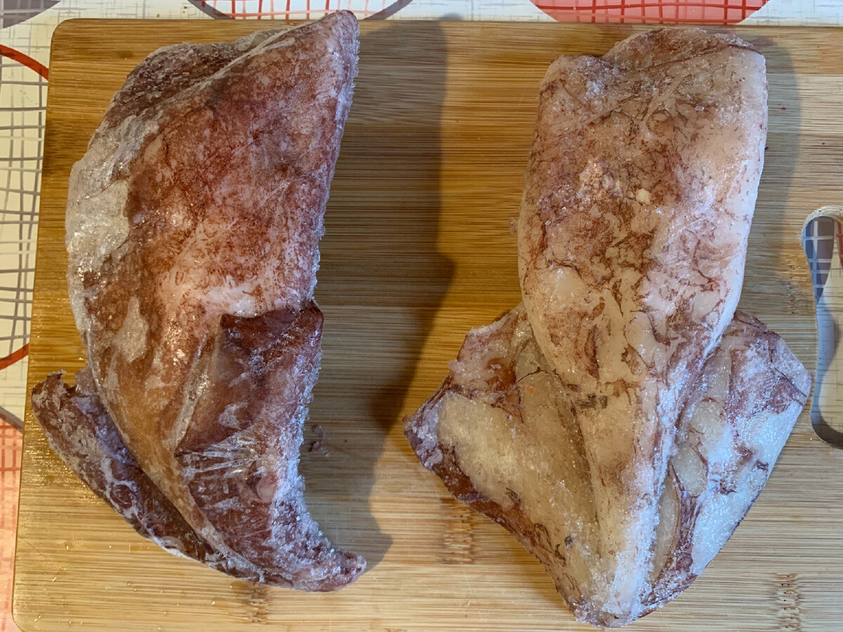 Кальмары! Один из самых вкусных и при этом недорогих морских гадов. Уж сколько споров я слышала и читала о том как правильно их варить!) кулинары давно разделились на два лагеря: тех, кто варит кальмары 2мин и считает это единственно верным способом, и тех, кому не жалко 40 минут своего времени) и варят кальмары именно столько! Я решила провести эксперимент. И помогут мне в этом парочка замороженных кальмаров) Итак! За команду «2мин» выступает тот, что справа! Для удобства отслеживания его судьбы назову его Валера!) вполне подходящее имя!) Ну а за команду «40 мин» выступает тот, что слева. Пусть он будет Геннадием!) По размеру и форме Валера и Геннадий идентичны. Ведь я провожу эксперимент и такие тонкости очень важны) Для начала хорошенько мою и очищаю наших подопытных) Все фото будут сделаны в одинаковых условиях: на одной доске. Так нагляднее видно, как изменится размер кальмаров. Воду я предварительно разогрела и добавила туда соль и лавровый лист. Первым туда отправляем Валеру.