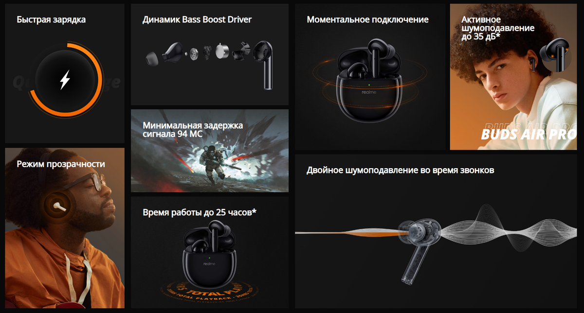 Взялся я за обзор Realme Buds Air Pro и пошёл посмотреть, как сейчас вообще дела на рынке таких наушников. Сейчас в продаже вы можете найти довольно много TWS-наушников разной степени убогости качества — от нормальных AirPods до очень спорных Huawei Buds и совсем не спорных поделок вида True Wireless HD loseless 3D sound noise cancelling по 399 рублей.
