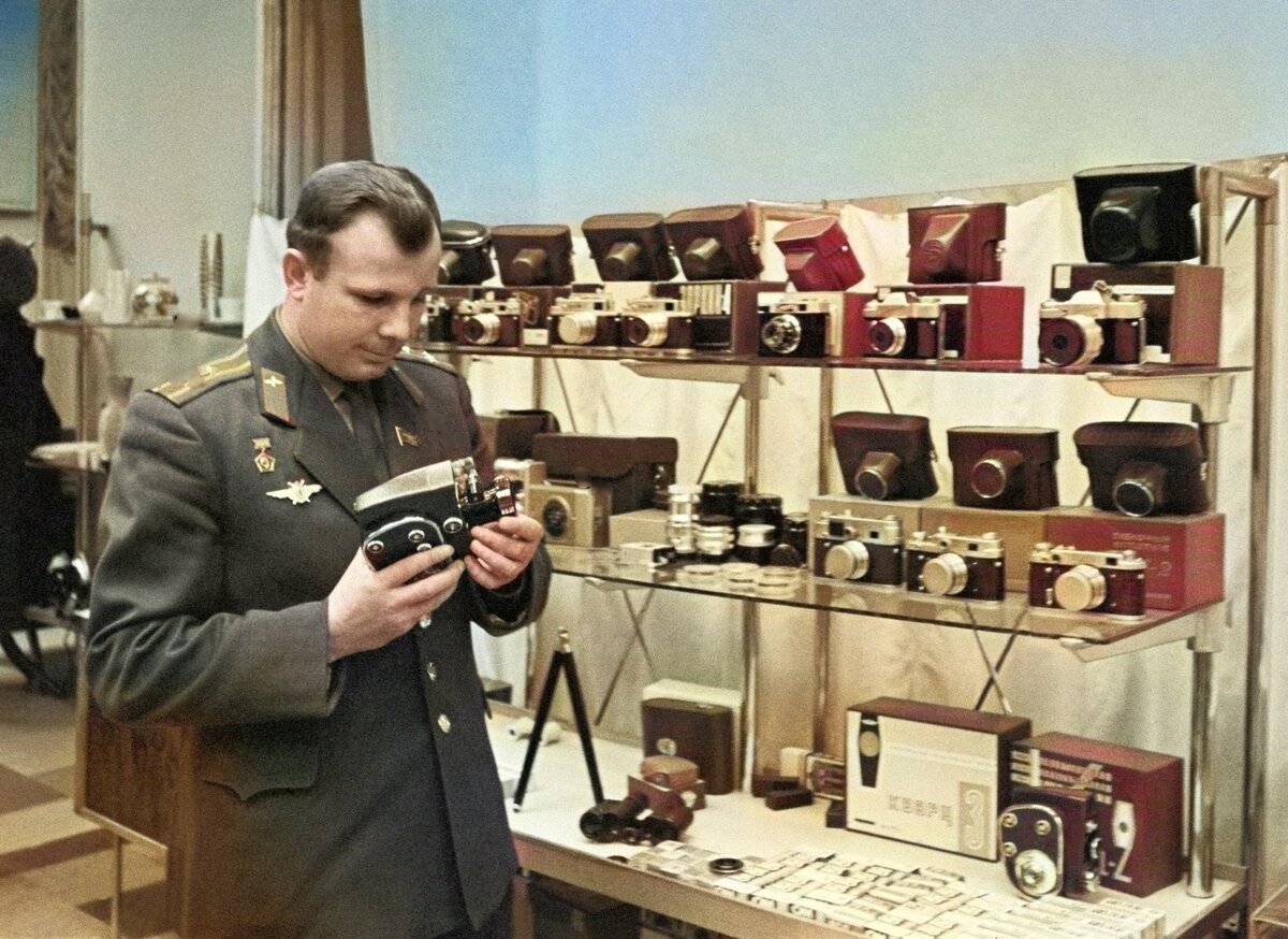 Попалась на глаза фотография Юрия Гагарина, вероятно на какой-то выставке, где он рассматривает кинокамеру. По надписи на коробке легко удалось определить что это кинокамера "Кварц-3". Кинокамера "Кварц-3" является модификацией базовой модели "Кварц" и выпускалась на Красногорском механическом заводе, в период с 1963 по 1969 годы. Это надежная и безотказная механическая кинокамера, как автомат Калашникова. Имеет объектив с переменным фокусным расстоянием (зумм-объектив), может снимать со скоростью 8,16,24 и 48 кадров в секунду. А вот какой кино-фототехникой пользовался Гагарин в жизни? Есть в интернете фотография в домашнем интерьере, на столе стоит коробка с надписью "Yashika 8". "Yashika 8-EIII" - это модель японской механической камеры, которая выпускалась с 1959 года. Камера снимала на 8 мм. кинопленку и имела в комплекте 3 сменных объектива, плюс отдельный видоискатель на каждый объектив. В руках у Юрия Алексеевича немецкий фотоаппарат Exakta VX llb - зеркальная фотокамера изг