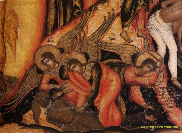 Первый лик Диавола 1. Вельзевул был князем серафимов и следующим после Люцифера. Поскольку все князья, то есть все начальники девяти ангельских хоров, являются падшими, то следует знать, что первыми от хора серафимов отпали Люцифер, Вельзевул и Левиафан, которые возглавили все восстание. Но четвертым был Михаил, который первым выступил против Люцифера, и все добропорядочные ангелы последовали за ним, так что теперь он является самым главным из них. Вельзевул склоняет людей к гордыне. И как Иоанн Креститель занял место Люцифера в Раю благодаря своему смирению, так и Вельзевул имеет на небесах своего противника - апостола евангелиста Иоанна Богослова. 2. Левиафан является князем той же степени, склоняющим людей к грехам, прямо противоречащим вере. Противостоятель: апостол Петр. 3. Асмодей, падший серафим, имеющий огромную силу, которую не утратил до настоящего времени, и является князем низменных желаний. Противостоятель: апостол Лука. 4. Бальберит являлся князем херувимов. Он склон