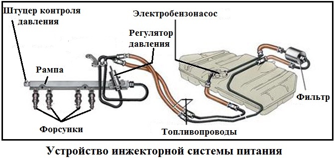 Устройство системы питания инжекторного двигателя Система подачи топлива инжекторного двигателя получила распространение в современных автомобилях и имеет ряд преимуществ перед топливной системой карбюраторного двигателя. В этой статье мы рассмотрим устройство инжектора и узнаем, как работает система подачи топлива инжекторного двигателя и электронная система питания. Устройство инжектора Основная задача системы питания инжекторного двигателя заключается в обеспечении подачи оптимального количества бензина в двигатель при разных режимах работы. Подача бензина в двигатель осуществляется с помощью форсунок, которые установлены во впускном трубопроводе. Устройство системы питания инжектора: электробензонасос, топливный фильтр, рампа форсунок с топливными форсунками, регулятор давления топлива