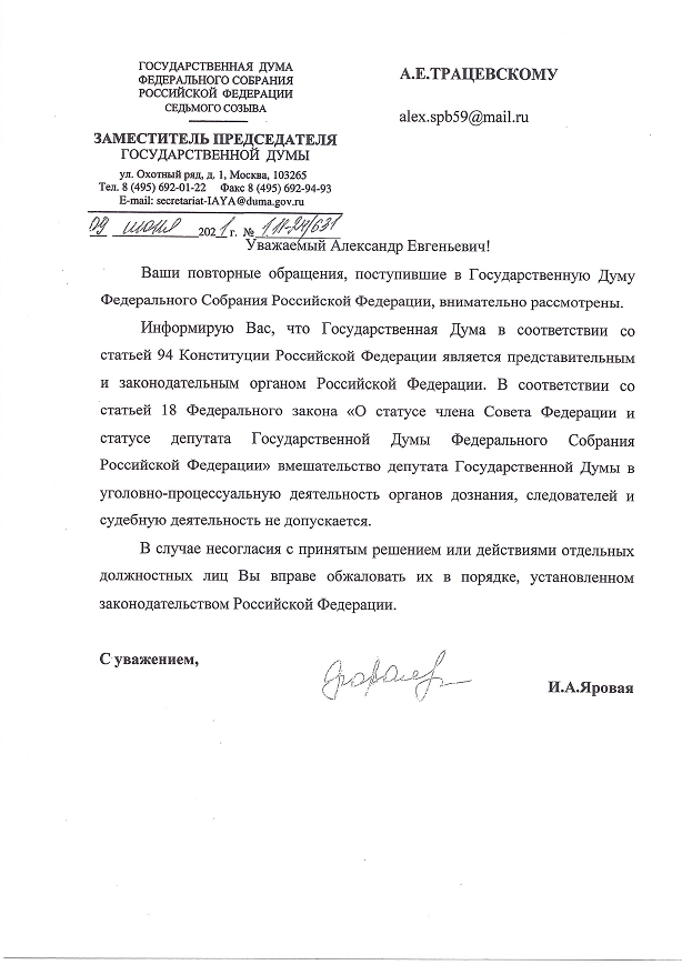 Текст: Добрый день, Ирина Александровна! 12.05.2021г. в мой адрес Депутатом Госдумы Петровым Ю.А. была направлена ОТПИСКА от 26.04.2021г. с набором лживых фактов о якобы проведенных проверках органами МВД и ПРОКУРАТУРЫ, в которых он опирается на абсолютно лживые, полные вранья ОТПИСКИ из ПРОКУРАТУРЫ СПб..., как и на приказ № 45 БЫВШЕГО ГЕН. ПРОКУРОРА ЧАЙКА Ю. от 31.01.2013г., в то время как 06.03.2020г. НЕНЕШНИМ ГЕН. ПРОКУРОРОМ КРАСНОВЫМ И.В. БЫЛО ПОДПИСАНО УКАЗАНИЕ ГЕН.ПРОКУРАТУРЫ №137/9 "О СОВЕРШЕНСТВОВАНИИ РАБОТЫ ПО РАССМОТРЕНИЮ ОБРАЩЕНИЙ ...", ни один пункт которого не ИСПОЛНЕН РАБОТНИКАМИ ПРОКУРАТУРЫ!!!??? Петрову Ю.А. Вы лично давали поручения разобраться в ситуации, творящейся вокруг нашей семьи, семьи ПОСТРАДАВШИХ, КЛЮЧЕВЫХ СВИДЕТЕЛЕЙ, ЧУДОМ ВЫЖИВШИХ И ВЫЖИВАЮЩИХ 21 год, после того, как нас с женой направил на "РАБОТУ" в АНГЛИЮ главарь МПГ по торговле людьми Яблоков И.Б. ООО "Вираж плюс-Интерстаффсервис-Колесо фортуны-Buon Lavoro" , которого активно, нагло и цинично защищает как МВД Центрального р-на СПб, так и Прокуратура этого же р-на, которых в свою очередь покрывает лживыми, полными вранья отписками, молчанием как структуры ГУ МВД по СПб так и Прокуратуры СПб, которым в свою очередь оказывает содействие как Центральный аппарат МВД, так и Генеральная Прокуратура РФ. НИКТО!!! НИКОГДА ЗА ДВАДЦАТЬ ОДИН ГОД НЕ ПРОВОДИЛ НИ ОДНОЙ ПРОВЕРКИ КАК ПО ДЕЯТЕЛЬНОСТИ МОШЕННИКОВ ИЗ МПГ ЯБЛОКОВА И.Б., ТАК и ЛЖЕКРЕДИТОРОВ ИЗ ЗАО "РИК" ТАРЛЕР Е.Л.... ЯКОБЫ НАШЕГО "ДОВЕРЕННОГО" ЛИЦА ДЕЙСТВОВАВШЕЙ В ФЕДЕРАЛЬНОМ СУДЕ ВЫБОРГСКОГО Р-НА СПб МАРКОВОЙ ПО ПОДДЕЛЬНОЙ ДОВЕРЕННОСТИ от 2005г.! СПУСТЯ ГОД ПОСЛЕ ВЫДВОРЕНИЯ НАШЕЙ СЕМЬИ НА УЛИЦУ В МАРТЕ 2004г.! И кражи ВСЕГО НАШЕГО ИМУЩЕСТВА, ДОКУМЕНТОВ...В ПЕРИОД МАРТ-АПРЕЛЬ 2004г.!!! ОДНАКО НИ ОДИН ИЗ ЭТИХ ПРАВДИВЫХ ФАКТОВ АБСОЛЮТНО ОСОЗНАННО НЕ ВИДИТ НИ МВД, НИ ПРОКУРАТУРА, НЕ ВИДЯТ ОНИ ТАКЖЕ ОСОЗНАННО МОШЕННИЧЕСТВА, УКЛОНЕНИЯ ОТ УПЛАТЫ НАЛОГОВ, ОСТАВЛЕНИЯ В ОПАСНОСТИ ЦЕЛОЙ СЕМЬИ..."ПРОВОДИТ ТАК НАЗЫВАЕМЫЕ ПРОВЕРКИ С НАРУШЕНИЕМ РЯДА ПОЛОЖЕНИЙ УПОМЯНУТОГО ВЫШЕ МНОЙ УКАЗАНИЯ ГЕН. ПРОКУРОРА РФ ОТ 06.03.2020г.ТАКИМ ОБРАЗОМ ПОЛУЧАЕТСЯ, ЧТО ЭТОТ ОТВЕТ-ОТПИСКА ЗА ПОДПИСЬЮ Ю.А. ПЕТРОВА ЯВЛЯЕТСЯ ОТВЕТОМ НА МОЮ ЖАЛОБУ В ВАШ АДРЕС ОТ 09.05.2021г.??? ОДНИМ СЛОВОМ НЕТ НИКАКОГО ДОВЕРИЯ К ВАШЕЙ ФРАКЦИИ, ГЛЯДЯ НА ОСОЗНАННОЕ БЕЗДЕЙСТВИЕ ВАШИХ ДЕПУТАТОВ МАРЧЕНКО Е.Е., БОЯРСКОГО С.М., А ТЕПЕРЬ И ПЕТРОВА Ю.А., Т.Е. ВСЕМ ТЕМ, кому ВЫ ДАВАЛИ ПОРУЧЕНИЯ ОСОЗНАННО ПЛЕВАЛИ НА ЭТУ ПРОБЛЕМУ, НА ГРАЖДАН РФ, КОТОРЫЕ ОКАЗАЛИСЬ В БЕДЕ!!! ПРОШУ ЛИЧНО ВАС РАЗОБРАТЬСЯ В СИТУАЦИИ! ПРОШУ ВАС ПОСМОТРЕТЬ ОТПИСКУ ИСХ.ЮАП 5/39 от 26.04.2021г. за подписью Ю.А.ПЕТРОВА!?