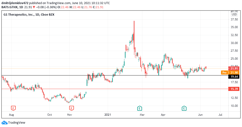 Приветствую. В этом обзоре я хотел вернуться к высокорисковым активам, которые мы рекомендовали в обзоре американского фондового рынка от 7 мая. Да, там можно теперь посмотреть результат данной инвестиции. В целом, он удовлетворительный и вы сами в этом сможете убедиться здесь. Также здесь я расскажу, что делать дальше. Наши прогнозы на 7 мая: Вот здесь я давал рекомендации по 3 перспективным, но высокорисковым компаниям. Некоторым нашим читателям не нравится консервативная доходность и многие охотятся за компаниями, которые могут потенциально принести более 100% годовых или же компании, что на краткой дистанции принесут большую прибыль. Давайте посмотрим, что нам удалось получить. Акции G1 Therapeutics: Биофармацевтическая компания. Честно, я говорил, что прогнозы в целом удовлетворительны, но не полностью. Да, от прошлых цен акции выросли, но этот результат неудовлетворителен для меня. Поэтому, мое личное мнение – если вы входили по нашим рекомендациям в эту компанию, то можно уже фи