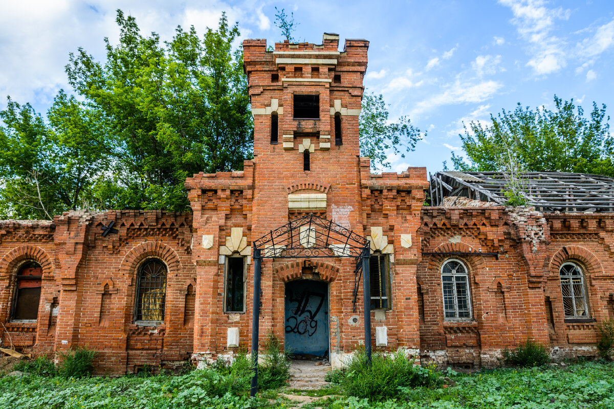 7. Вернёмся с берега Волги наверх, к слонам. Слева от них видно единственное (если не считать ворота) сохранившееся со времён Самариных сооружение - бывшая контора управляющего. Согласно проекту, в ней собираются открыть музей, но пока строение напоминает скорее руины какого-то древнего замка с узкими окошками-бойницами.