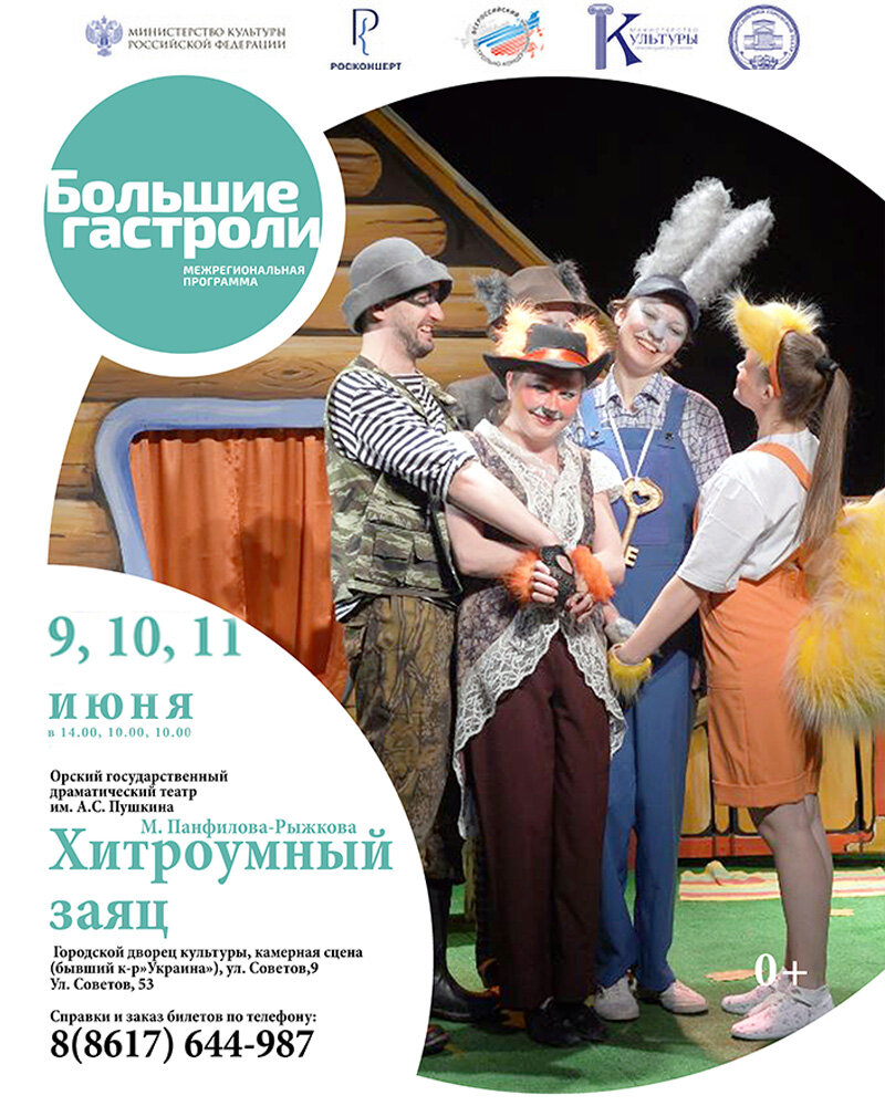 Хитроумный заяц Сказка с элементами интерактива. М. Панфилова-Рыжкова (0+) Веселый, но при этом, поучительный спектакль. Он погрузит маленьких зрителей в добрый мир сказки, которая научит маленьких зрителей очень важным правилам безопасности. Потому что в сказочном лесу, как и в мире людей, есть разные — добрые и злые, хитрые и простодушные, сильные и слабые. Лесная сказка расскажет о том, как природная смекалка Зайца помогает победить Лису и Волка, и как научить уму-разуму наивную Белку. Касса театра (8617) 644-987