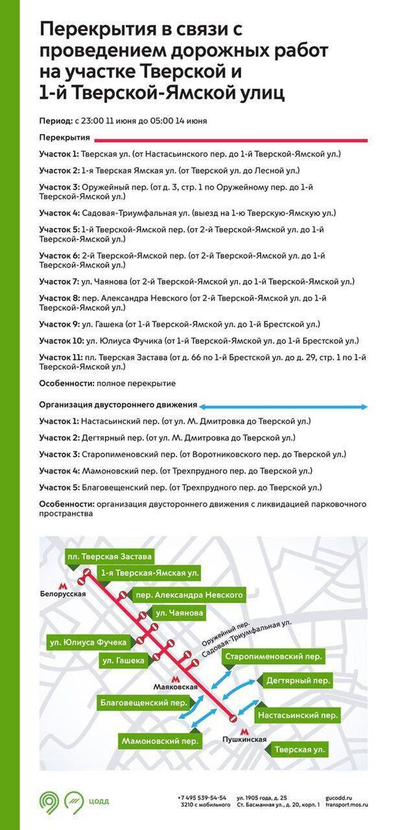 🔹С 23:00 11 июня до 5:00 14 июня будут перекрыты участки Тверской и 1-й Тверской Ямской улиц от Настасьинского переулка до Лесной улицы. Объезжайте по Садовому и Бульварному кольцам, ул. Малая Дмитровка, ул. Долгоруковская, 1-я и 2-я Брестская улицы, 2-я и 3-я Тверская-Ямская улицы, Александра Невского, ул. Грузинский Вал, ул. Большая Грузинская. Заранее постройте маршрут, если вам необходимо на машине в центр.