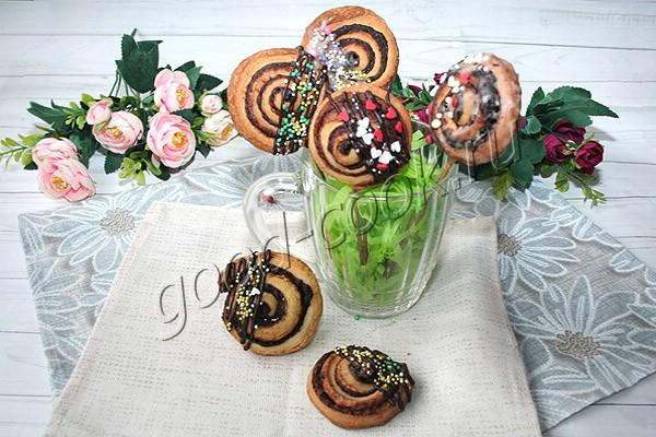 Желательно эти печенья долго не хранить, так как они становятся жёсткими. Категория: Сладкие печенья СОСТАВ 250г слоёного теста 1 ч ложка какао (5г) 1/5 стакана сахарной пудры (40г) 2 ч ложки растительного масла (10г) посмотреть калорийность» Слоёное тесто раскатать в пласт размером примерно 20х30 сантиметров. Смазать растительным маслом. Через ситечко посыпать смесью сахарной пудры и какао. Свернуть в тугой рулет по меньшей стороне. Нарезать на шайбы толщиной 1,5 сантиметра. Уложить спиральки на противень, застеленный бумагой для выпечки. При желании в шайбы воткнуть деревянные шпажки, в этом случае получатся печенья на палочках. Выпекать при t=200°C до зарумянивания - 8~11 минут. Готовые печенья после выпечки можно посыпать сахарной пудрой или помазать сахарным сиропом (сахар с небольшим количеством воды довести до t=105°C). Также печенья можно покрыть сеточкой из растопленного шоколада. Источник: https://www.good-cook.ru/tort/tort_1339.shtml Подписывайтесь на мой кан