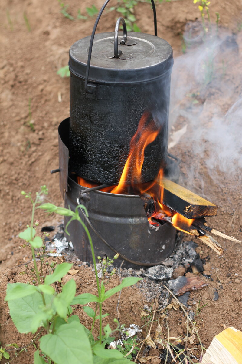 Сегодня речь пойдёт об моей самодельной печке щепочнице. Эта приспособа более 6 (!!!) лет служит мне верой и правдой. Как то давно, после покупки Нивы стал вопрос об приспособе для быстрой и экономной готовки пищи. Но небольшого транспортного размера и веса. Непосредственно эта печка была выпилена из старого самодельного 5-и литрового котелка. Но можно сделать из листовой нержавейки, из черняги не рекомендую будет ржаветь из за постоянной сырости (туманы, конденсат, дождь) и прогорит быстро. Работа несложная, главное чтоб руки не из жопы росли. Скрепить на болты или заклёпки. Но лучше всё таки заварить. Состоит из 4-х частей: сам корпус подставка под корпус (круглый лист металла, чуть большего размера, чем само дно печки) экран от ветра ( обязателен, без него расход дров резко увеличится и будет задувать ветер) подставка под котелок. П-образная деталь из загнутой проволоки, лучше сталистой и толщиной не меньше 8 мм. Работает на мелком деревянном мусоре, который валяется на бере