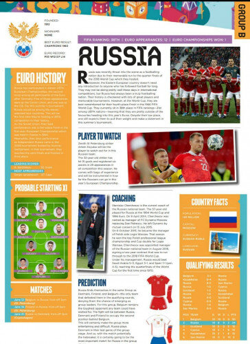 Россия не так давно пробралась на мировую сцену в качестве футбольной страны, что случилось благодаря незабываемому выходу в четвертьфинал мундиаля 2018, проходившего у нее дома. Однако для тех, кто следит за футболом давно, эта страна в представлении не нуждается. На текущий момент Россия стоит на 38 месте в рейтинге ФИФА, а если взять только европейские сборные, то она окажется на 21 строчке. Это означает, что русские находятся сильно далеко от фаворитов, которые отправятся на Евро в этом году. Но несмотря на низкую позицию в рейтинге, все же можно ожидать того, что на континентальном турнире Россия заявит о себе и выполнит свои задачи. Главный тренер 57-летний Станислав Черчесов, выступавший за сборную России на чемпионате мира 1994 и Евро 1996 в качестве игрока, сейчас возглавляет национальную команду. Он известен по работе в московском «Динамо», где сменил Дэна Петреску, а после «Динамо» тренировал варшавскую «Легию», с которой сделал золотой дубль, выиграв чемпионат и Кубок По