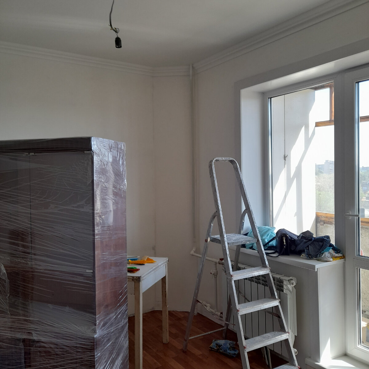 Эта комната 9,5 м2 (спальня родителей) находится в 3х комн. квартире панельного девятиэтажного дома 1991 года постройки. В этой квартире мы сделали полный ремонт за исключением пола. После демонтажа старого покрытия со стен и потолка, заменили от автоматов электропроводку, при этом сделали дополнительные силовые точки и перенесли старые. Затем стены и потолок прогрунтовали, выровняли штукатуркой "Ротбанд", зашпаклевали стены гипсовой шпаклевкой, а потолок финишной на 2 слоя. После полного высыхания раствора, прошлифовали стены прогрунтовали, а потолок и потолочный молдинг, который наклеили на жидкие гвозди "Момент Монтаж" покрасили водоэмульсионной белой краской. Вот так выглядела комната после всех вышеописанных работ. На фото ниже, я наклеила обои, муж на пол установил пластиковый плинтус и потолочный карниз. Обои наклеены виниловые горячего тиснения 3 рулона по цене 2000 руб./рулон. Здесь смотрите другие комнаты в этой квартире: До и после. Полный ремонт комнаты 19 м2 или какие об