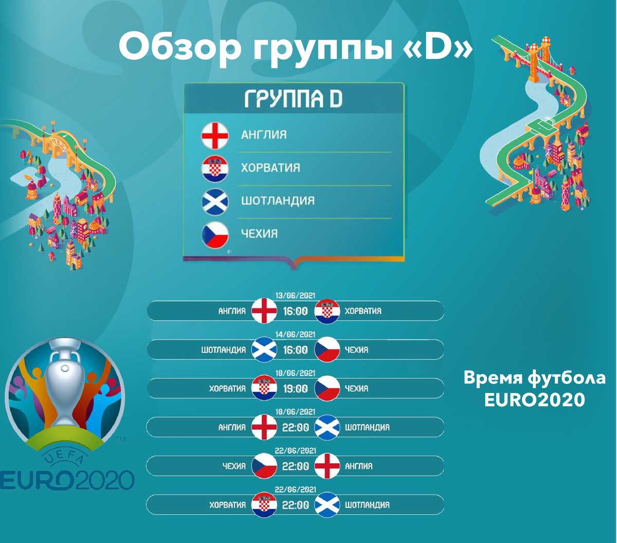 В состав группы "D" вошли такие сборные, как Англия, Хорватия, Чехия, Шотландия. По составу равная группа, лишь англичане не фоне своих конкурентов немного выделяются из-за наличия более мастеровитого состава. Но все остальные сборные неуступчивые и поэтому мы в праве ждать горячую борьбу за выход из группы.