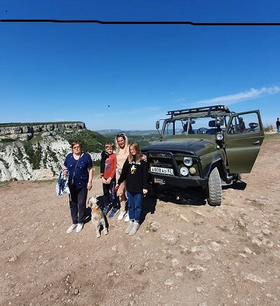 Едем в Бахчисарай с целью посмотреть Ханский дворец. Заезжаем на стоянку. Подходит молодой человек и предлагает заменить осмотр Дворца на джип-тур. После некоторых переговоров и раздумий решаем следовать совету и садимся в «джип» советского автопрома. Гид Алексей и он же водитель-симпатичный молодой человек уверяет нас в надежности автомобиля и своего бережного отношения к автоветерану. Начинаем движение по узким улочкам Бахчисарая, забираясь все выше и выше. Узкая гравийная дорога петляет между частных домов. Заканчивается Бахчисарай и начинается настоящая мозготряска: уазик бросает из стороны в сторону на разбитой дороге. Встречные автомобили на закрытых кустарником участках дороги гудками предупреждают, что однополосная дорога занята. Подпрыгиваем на очередных кочках и ухабах, вцепившись в поручни. Наша цель-пещерный город Чуфут-Кале. Делаем три остановки на смотровых площадках. 1. остановка 2. остановка 3.остановка Перед воротами пещерного города мы высаживаемся, заходим