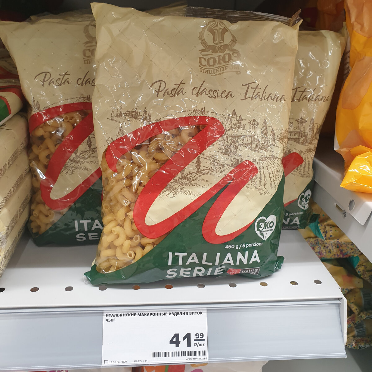 Часто попадаются "итальянские" макароны где всё написано на итальянском языке. Или почти всё, но где-нибудь в далёком уголке будет едва заметна надпись на русском языке, вроде этой: если на упаковке стоит маркировка А, то они произведены в Италии. Если E, то тоже в Италии. Если О, то в России, если D, то в Италии. Заметьте как похожи D и O, особенно если будут на нервной прозрачной упаковке выбиты мелким шрифтом. Разумеется, на таких макаронах в основном (или всегда) попадается маркировка, которая скажет о том, что произведены они были не в Италии. Зато сколько пафоса со словами, шрифтом, картинками и стилистикой. Юридически такое возможно, чем и пользуются производители. Логично, за ₽41.99 никто не будет продавать настоящую pasta из Италии, но такое встречается нередко и на более дорогих позициях.