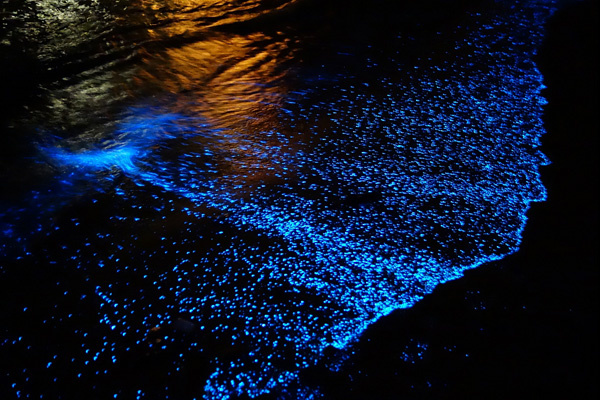 Мальдивы покоряют не только прекрасным климатом и райским морем, но и невероятными и удивительными чудесами. Одним из них стал светящийся пляж Ваадху. Ночью здесь создается полное ощущение, что звездное небо упало в воду. Волны озаряются изнутри миллионами крохотных звезд, которые весело накатывают на берег, остаются в небольших лужицах, подсвечивают следы от ног. Зрелище на самом деле нереальное и незабываемое! Кажется, что все звезды мира отражаются в зеркале воды, множась на яркие точки и острые световые лучики. На самом деле все гораздо проще. Такую подсветку обеспечивает огромное количество фитопланктона, живущего в прибрежных водах. И он совсем не радуется наступлению ночи, а, наоборот, сильно раздражается от соприкосновения с песком. И чем больше раздражение, тем сильнее свечение. Именно поэтому такое явление наблюдается только около берега. Кстати, многие туристы пытаются запечатлеть себя в удивительной рамке волшебных огоньков, но терпения получить серию уникальных снимков хва