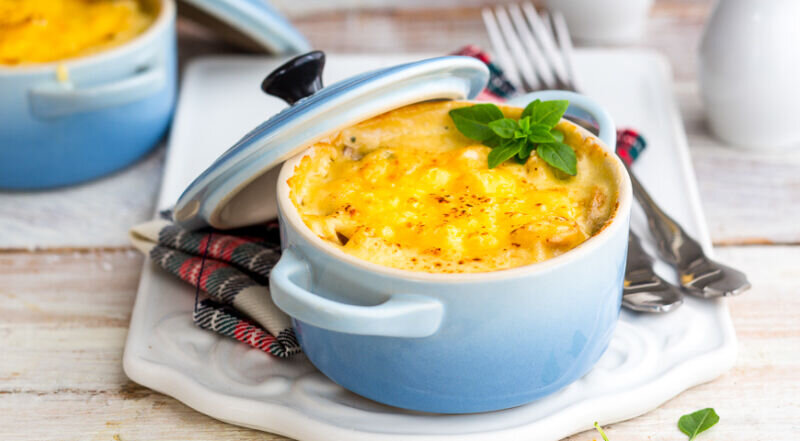 Перекладываем горячее кушанье в керамические горшочки или кокотницы. Сверху выкладываем горсть тёртого сыра.