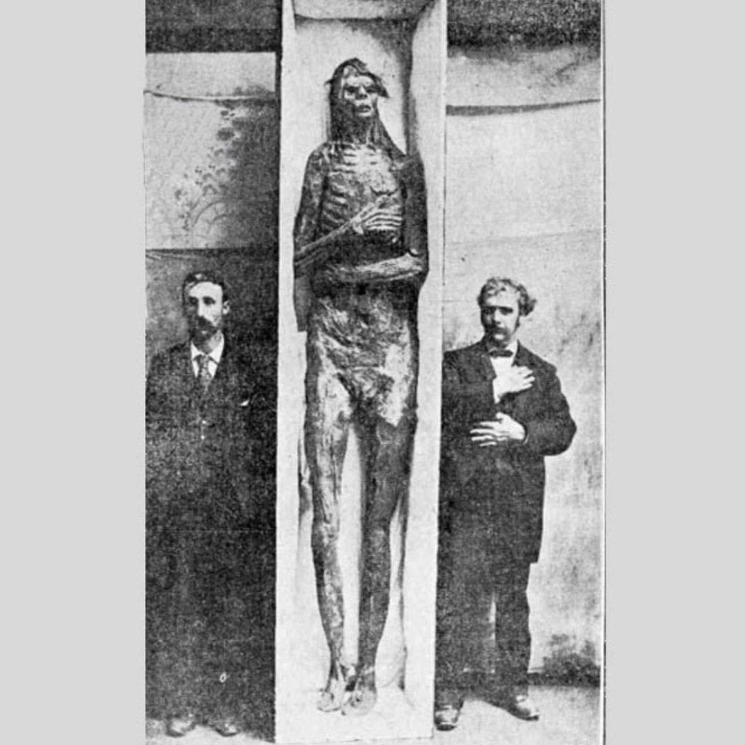 Эту мумию гиганта (2 метра 54 сантиметра, а при жизни он был на 20 см выше) нашли охотники недалеко от Сан-Диего, США в 1895 году. Её сразу же отправили в Смитсоновский музей для изучения. И как не странно, её изучали и не доносили до общественности результаты. Подлинность мумии подтверждали главный анатом Смитсоновского университета профессор Лукас, а так же глава американского бюро этнологии профессор Макги. Но угадайте, что случилось потом? Правильно. Примерно через год даже вышеупомянутые ребята «переобулись» и сказали, что мумия поддельная. Как они изучали её столь длительный срок и не заметили – загадка. Общественность подняла шумиху и требовала провести независимую экспертизу, но ответ представителей Смитсоновского музея был гениальный: «Мумия была уничтожена, т.к. является подделкой и не представляет какой-либо ценности и научного интереса». Ну а как известно «нет тела, нет и дела».