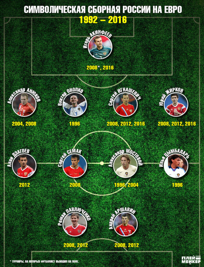 Перед стартом Евро-2020 «Плеймейкер» собрал в одной виртуальной команде всех самых ярких отечественных футболистов, выступавших на континентальных первенствах в российский период.
