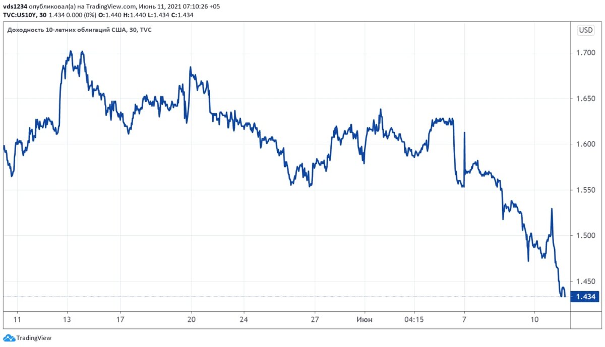 Вчера рынки неплохо выросли после опубликования статистики по американской инфляции. С начала года из каждого утюга трубят о том, что из-за роста инфляции повышается доходность американских гособлигаций. Вчерашняя статистика показала, что инфляция в США продолжает расти. Можно было бы ожидать, что доходность американских гособлигаций вновь рванёт вверх (как это происходило ранее в 2021 году). Однако доходность облигаций, наоборот, стала стремительно снижаться. 📊 В целом за последнюю неделю доходность 10-летних гособлигаций США упала с 1,627 до 1,434% годовых, достигнув своих минимумов за последний квартал (см. график). Причём доходность облигаций продолжает падать и после публикации инфляционной статистики. Может быть институциональные инвесторы паркуют свои капиталы в облигациях, опасаясь каких-то рисков? __________