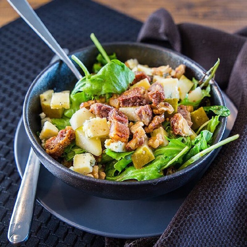 Салат шампиньоны с беконом Вкусный грибной салат понравится как мясоедам, так и вегетарианцам (если исключить из составляющих бекон). Из расчёта на одну порцию нам понадобятся: 🔹Грибы шампиньоны свежие – 40 гр. (1 шт) 🔹Бекон сырокопченый – 35 гр. 🔹Салат айсберг – 30 гр. 🔹Фасоль стручковая с/м. – 63 гр. 🔹Масло оливковое – 25 гр. (1,5 ст. л.) 🔹Сок лимона – 6 гр. (1 ч.л.) 🔹Укроп – 7 гр. 🔹Уксус белый винный – 1 гр. 🔹Горчица зернистая – 5 гр. 🔹Соль, перец ( по вкусу ) Приготовление: 1️ Фасоль положите в кипящую подсоленную воду. Как только она начнет всплывать, переложите в воду со льдом или остудите, промыв холодной водой (это нужно для того, чтобы фасоль не потеряла сочный зеленый цвет). 2️ Грибы нарежьте слайсами, бекон квадратами 3х3 см, обжарьте на раскаленной сковороде с небольшим количеством масла, добавьте перец. Если бекон достаточно соленый, можно не солить. 3️ Салат айсберг промойте, просушите и порвите руками. 4️ Отдельно смешайте оливковое масло с соком лимона, горчи
