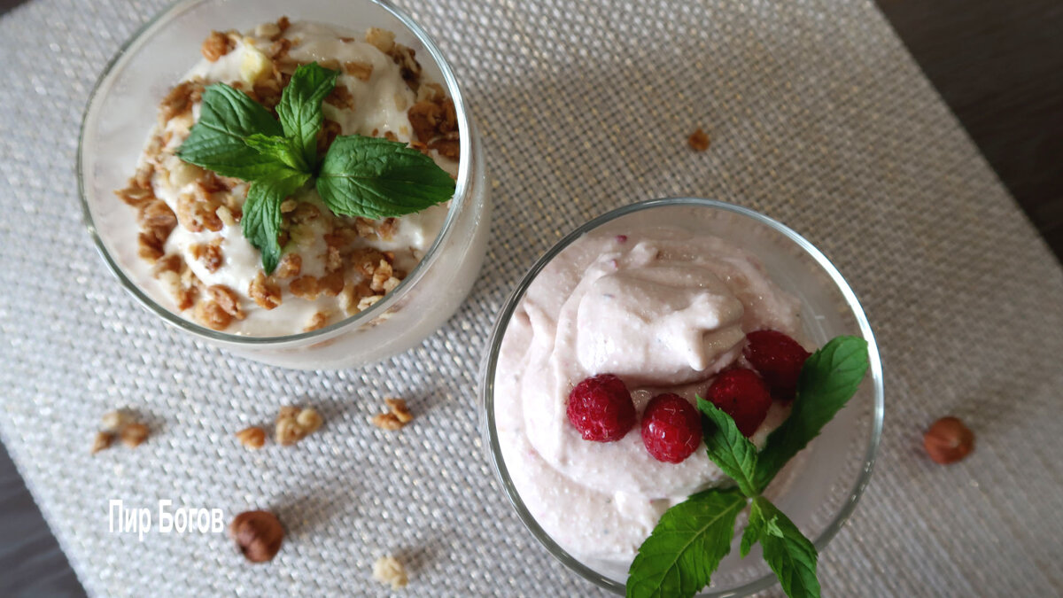 Легкий низкокалорийный десерт прекрасно подойдет на вечер и на праздничный стол. Для приготовления можно использовать разные ягоды, фрукты, орехи, горький шоколад. Вкусная и прохладная сладость относится к ПП рецептам и не нанесет вреда вашей фигуре. А если перед подачей подержать немного в морозилке, то прекрасно может заменить мороженое в жаркий летний день. Ингредиенты даны на две порции. *** Подробный рецепт можно увидеть в видео на моем канале здесь или на канале YouTube Пир Богов вот здесь 🍨. Еще там есть много вкусных рецептов. 🥗🥧Подписывайтесь))) 😉 *** Состав: 2 банана 360гр творога 1 нектарин 6 ягод малины 2 листика базилика Мюсли, ягоды, мята для оформления Способ приготовления: Бананы почистить от кожуры и нарезать на колечки. Нектарин без косточки и кружочки банана заморозить. Творог подморозить немного. Первый вариант. В блендере измельчить ½ часть творога, нектарин, 1 банан и нарезанный лист базилика. Готовую массу можно подавать сразу или отправить в морозилку заст