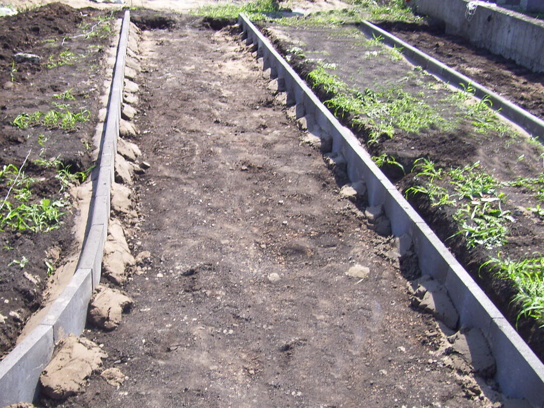 Бригада таджиков поставила бордюры на небольшой фундамент, в который заложила три прутка арматуры. Получается импровизированный бетонный замок.
