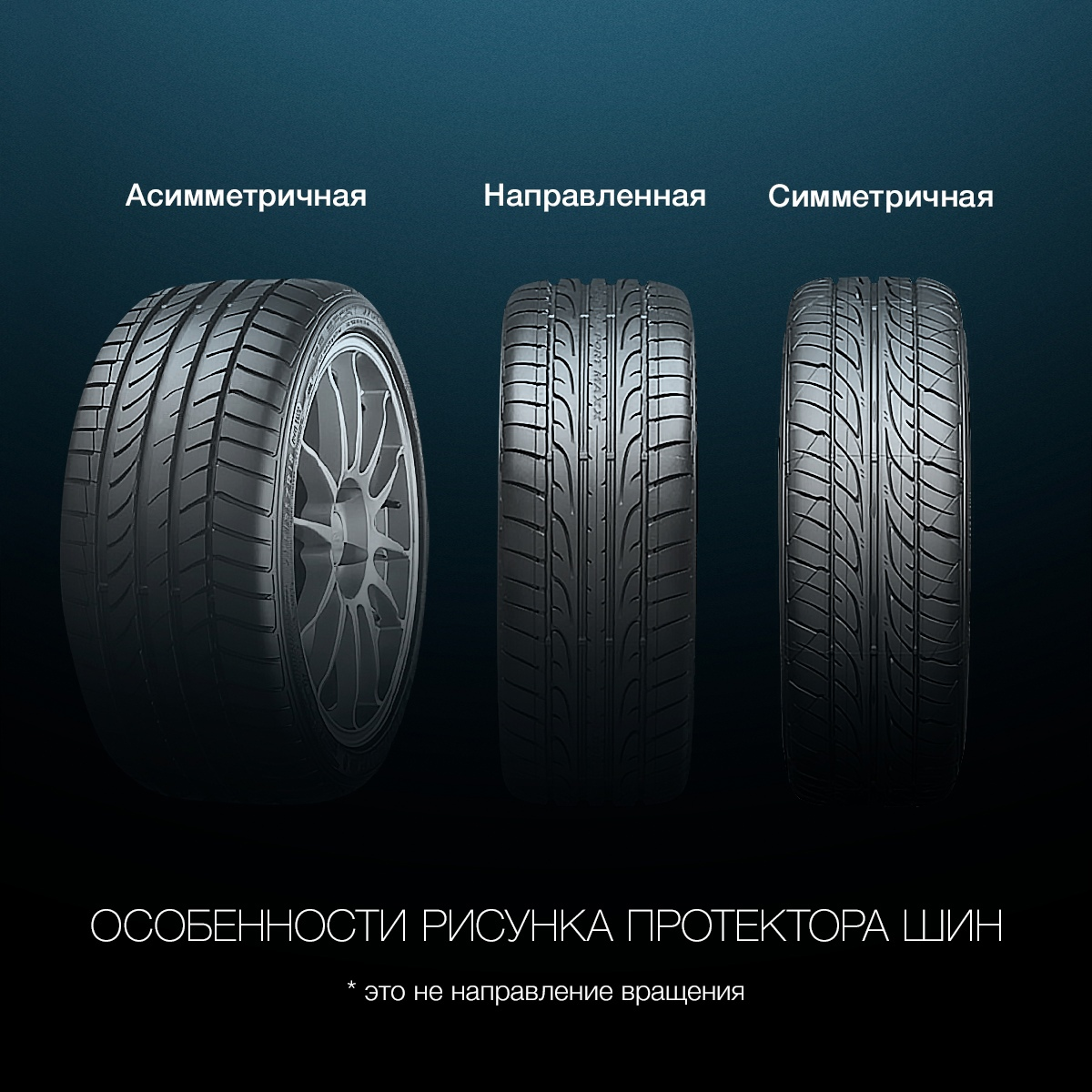 Протектор — это часть шины, которая контактирует непосредственно с дорогой, обеспечивает сцепление с поверхностью, принимает на себя большие нагрузки и защищает внутреннюю часть шины от повреждения. Рисунок протектора — своего рода «лицо» шины, та ее часть, которая обращает на себя внимание в первую очередь. У каждой модели — свой особый рисунок протектора. Что нужно знать о типах рисунка, чтобы выбрать подходящий комплект? Давайте разбираться. Видов рисунка протектора существует несколько: Симметричный направленный рисунок Представляет собой V-образный рисунок («елочка»). Такие шины следует устанавливать на диск строго в том направлении, которое указано стрелкой на боковине: она задает правильное ее вращение (надпись «Rotation»). Симметричные направленные шины хорошо отводят воду из пятна контакта и демонстрируют прекрасные характеристики на мокрой дороге. Симметричный ненаправленный рисунок Пожалуй, самый распространенный тип. Одно из основных преимуществ шин с подобным рисунком — в