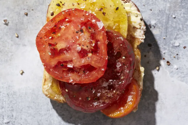 Что отличает эти томатные тосты, так это волшебство кусочков спелых помидоров, которые находятся прямо на границе сладкого и соленого, между фруктами и овощами. Щепотка соли подчеркивает их сочность, мед подчеркивает их сладость, а ореховые нотки цельнозернового хлеба делают сэндвич невероятно вкусным.