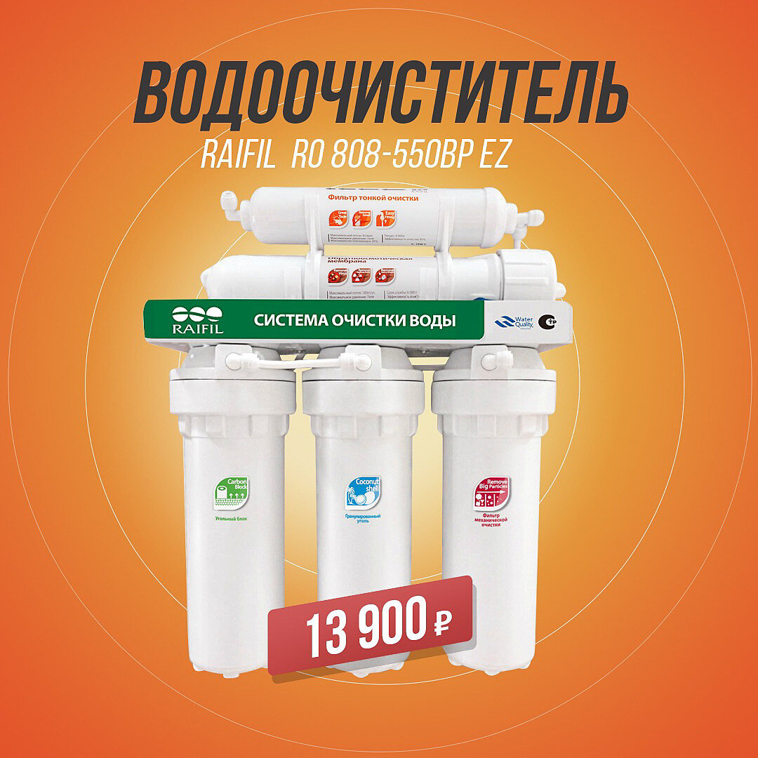 Фильтр для воды Raifil RO 808-550BP-EZ применяется в качестве бытовой системы очистки воды на основе обратного осмоса с целью получения очищенной воды для ее употребления в качестве питьевой. ✅Фильтр для воды Raifil RO 808-550BP-EZ представляет собой обратноосмотическую систему фильтрации с насосом, состоящую из пяти ступеней последовательной очистки: 1. Картридж из вспененного полипропилена 10 мкм (SC-10-10) предназначен для удаления из воды взвешенных частиц окалины, ржавчины, глины, ила и др. для защиты ступеней тонкой очистки воды от их засорения; 2. Картридж с наполнителем из гранулированного активированного угля (GAC-10R-C) отвечает за очистку воды от примесей хлора, органических соединений, гербицидов и пестицидов; 3. Карбон-блок или фильтр из спрессованного активированного угля (CBC-10-10) с фильтром 10 мкм предназначен для удаления органических соединений и хлора; 4. Обратноосмотическая мембрана со степенью фильтрации 0,0001 мкм выполняет основную роль в данной системе, у