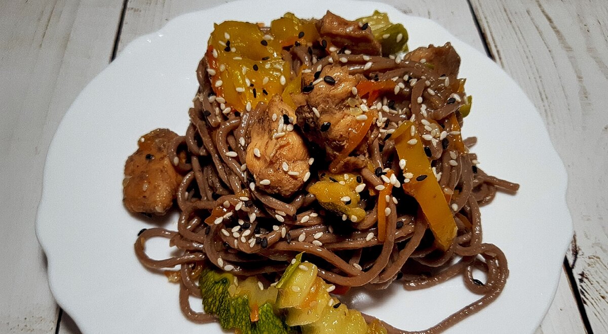 На 100 гр Калории 97 Белки 7,9 Жиры 2,1 Углеводы 12 ИНГРЕДИЕНТЫ Куриная грудка 0,5 кг Гречневая лапша 300 гр (выход лапша вареная 900 гр) Кабачок 1 шт (250 гр) Морковь 2 шт (100 гр) Перец сладкий 1 шт (150 гр) Лук 1 шт (100 гр) Масло растительное 2 ст.л. Соевый соус 50 мл Соус Терияки 100 гр Смесь перцев Соль Кунжут