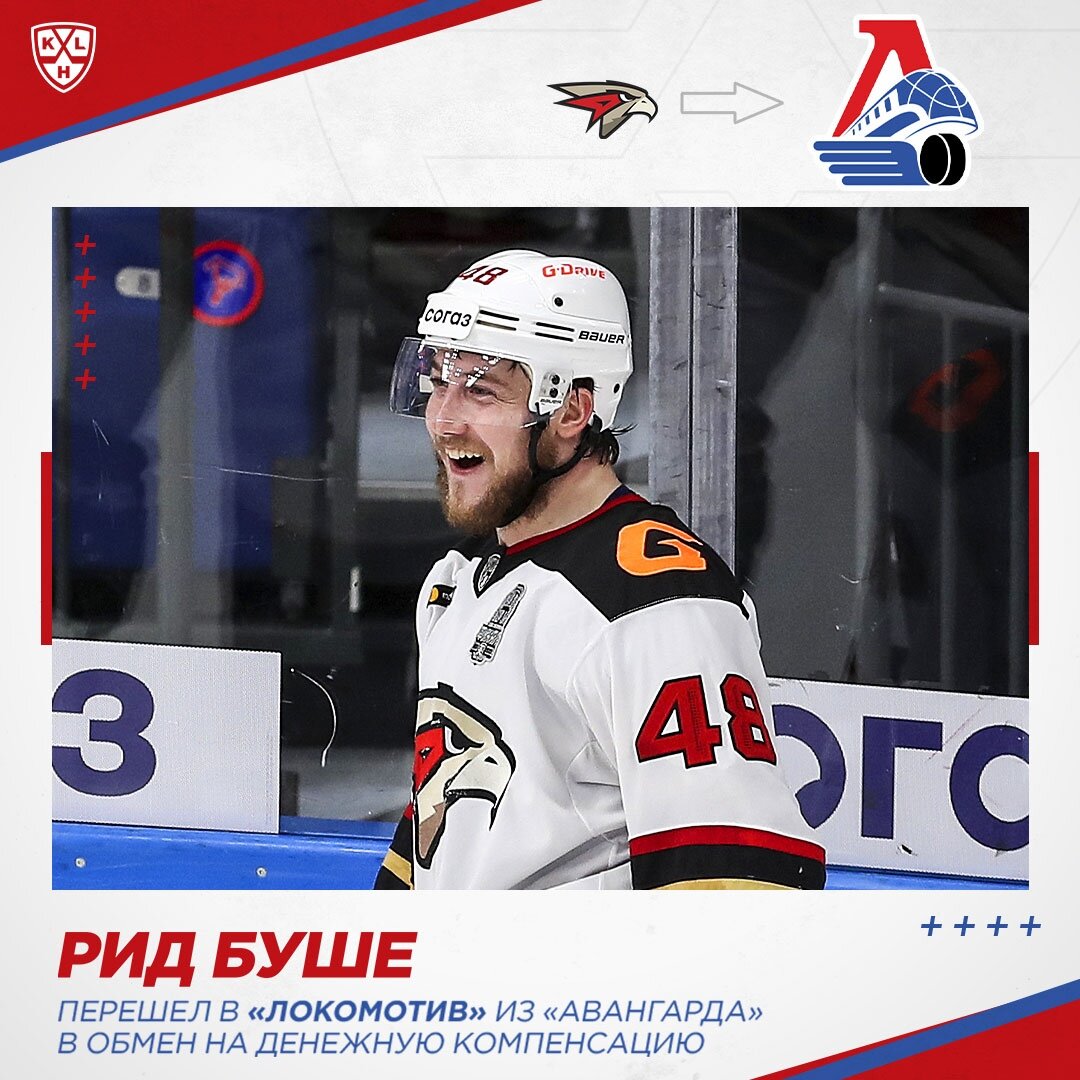 «Авангард» и «Локомотив» совершили обмен, в результате которого Рид Буше перешел в ярославский клуб. Омский клуб получил в сделке денежную компенсацию. «Буше показал отличную игру в прошедшем сезоне, и мы, конечно, сделали ему максимально возможное предложение в рамках потолка зарплат. Однако игрок его отклонил, получив другое предложение из «Локомотива». Мы имели возможность оставить права на Буше у себя и не позволить ему перейти в другой клуб КХЛ, однако посчитали, что так поступить с Ридом будет неправильно. Поэтому было принято решение произвести с «Локомотивом» обмен. Мы благодарим Рида Буше за тот вклад, который он внес в наше чемпионство, и желаем ему успешного продолжения карьеры», – сказал генеральный менеджер «Авангарда» Алексей Волков. 48 (24+24) очков в 51 игре (рег. сезон) 17 (8+9) очков в 21 игре (плей-офф)