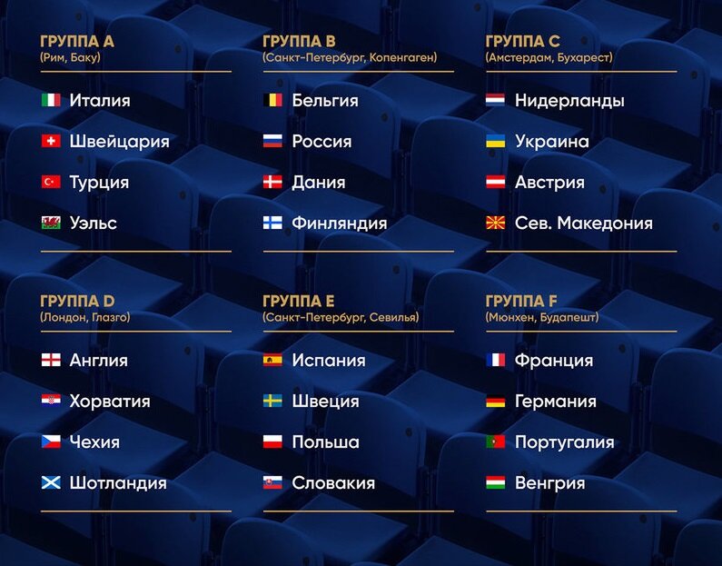 Второй раз подряд в финальной части Евро сыграют 24 сборные. Формат из 16 команд казался идеальным, но УЕФА пошел на увеличение состава участников ради большего количества матчей и, как ожидалось, прибыли. Впервые в истории два турнира разделили не четыре года, а пять лет. Причину пояснять не нужно. Состав и Формат Нынешний Евро пройдет сразу в 11 странах — в честь 60-летия турнира, который планировалось провести год назад. Изначально стран было на одну больше, но Ирландия вынуждена была отказаться от проведения — правительство в условиях пандемии не смогло гарантировать безопасный допуск болельщиков на трибуны. В итоге матчи из Дублина были перенесены в Петербург, который примет сразу семь игр (шесть на групповой стадии и один четвертьфинал). Полуфиналы и финал пройдут в Лондоне. На групповой стадии отсеется треть команд: домой поедут шесть сборных, финишировавших на последних местах в группах, плюс еще две команды, которые займут третьи места и будут иметь худшие показатели по сравн
