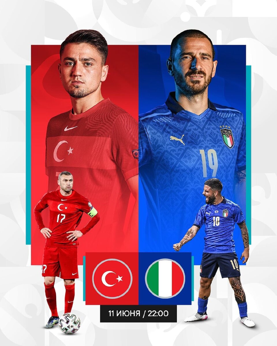 Сегодня стартует долгожданный праздник футбола-Чемпионат Европы. Турнир пройдёт в одиннадцати городах, а на футбольных полях встретятся самые лучшие игроки со всей Европы. Матчем открытия станет игра между Италией и Турцией. Игра пройдёт в Риме на арене «Стадио Олимпико», и начнётся в 22-00 по Московскому времени. Предположительный состав сборной Италии: Доннарумма; Флоренци; Бонуччи; Кьеллини; Спинаццола; Барелла; Жорджиньо; Верратти; Кьеза; Иммобиле; Инсинье. Предположительный состав сборной Турции: Угурджан Чакыр; Зеки Челик; Мерих Демирал; Чаглар Сеюнджю; Умут Мераш; Окай Йокушлу; Озан Туфан; Хакан Челханоглу; Дженгиз Юндер; Кенан Караман; Бурак Йылмаз. Чего ждать от игры? Италия и Турция достаточно редко играют друг против друга и последний их матч датируется 2006 годом. Это была товарищеская игра и закончилась она со счётом 1-1. Сегодняшний матч очень важный для обеих команд, на них возложена большая ответственность- дать старт крупному Европейскому турниру. Часто матчи открыт