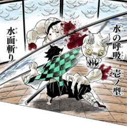 Дыхание воды — одно из пяти базовых дыханий, напрямую произошедших от дыхания солнца. Оно было создано учениками Ёриичи Цугикуни, попытавшимися изучить дыхание солнца, но из-за отсутствия такой врождённой силы, как у Ёриичи, им пришлось разработать альтернативные технике дыхания, сосредоточенные на их индивидуальных сильных и слабых сторонах. Одним из таковых стало Дыхание воды.[1] Дыхание воды — самый распространённый стиль среди истребителей демонов, так как его базовые техники проще освоить новичкам. На момент событий манги наиболее известным тренером, обучающим Дыханию воды кандидатов в истребители демонов, является Саконджи Урокодаки. Однако также есть и другие, менее известные тренеры. Атаки Стили боя Дыхания воды основаны на ударах и их комбинациях, совершаемых в движении. В стили заложена возможность их использования в ситуациях, когда у фехтовальщика нет твердой опоры под ногами. По этой причине в основе ударов лежит использование силы, полученной от вращения тела в сочетании