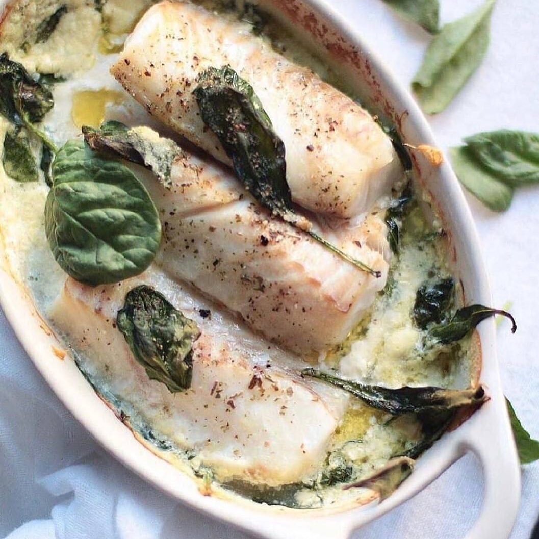 ▫️Выложить шпинат на дно формы, сверху рыбу. Немного сбрызнуть оливковым маслом. Залить сливками. Накрыть рыбу фольгой.