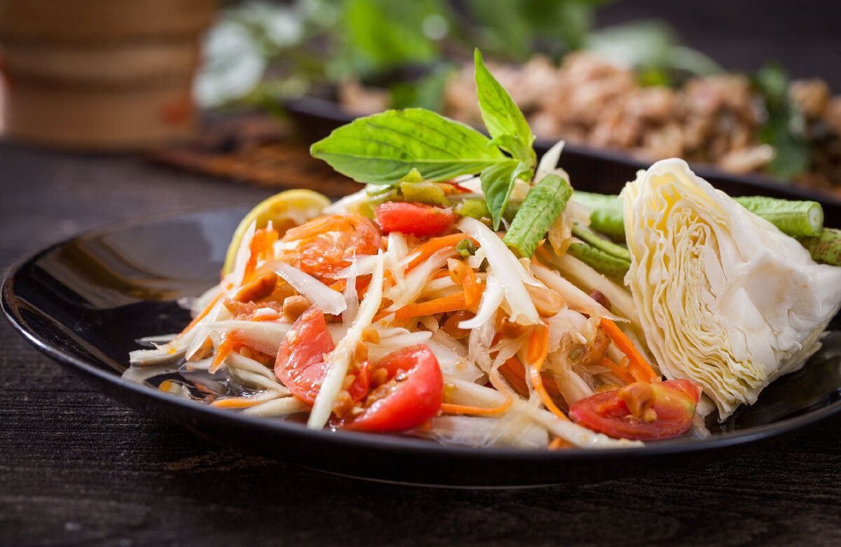 Аппетитный тайский салат – рецепт, который по праву можно назвать супер фудом. В каждом ингредиенте множество питательных веществ! Свежий, сытный, ароматный и невероятно вкусный, он станет новым вашим кулинарным пристрастием. Характерная особенность – тайский салат, рецепт которого прост, готовится из красочных ингредиентов. Готовое блюдо станет настоящим украшением праздничного стола или семейного ужина. Тайский салат: рецепт домашнего приготовления Обязательно порадует ваши вкусовые рецепторы этот замечательный тайский салат. Рецепт готовится очень просто. Вам нужно подготовить и измельчить ряд овощей. А также приготовить вкусную заправку. Готовое блюдо олицетворяет лето, с радугой цветов и калейдоскопом вкусов. Для салата: Для заправки: Приготовление: Тайский салат: рецепт с кунжутной заправкой Вы легко приготовите этот замечательный тайский салат. Рецепт с кунжутной заправкой действительно восхитителен. Он аппетитен и привлекает внимание красочностью. При первой пробе покоряет бога