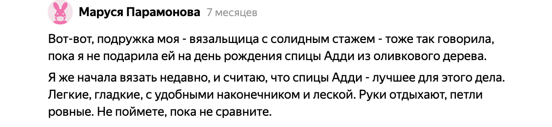 Если вы давно на меня подписаны, то наверняка помните, что я как-то признавалась: я не фанат фирменных спиц. Более того, всяческих брендов и в руках не держала. Вот моя заметка с чистосердечными признаниями. Я призналась: мои самые любимые спицы - китайские копеечные. За пару долларов пучок. Вот эти: ТЫЦ. В комментариях советовали: откажитесь от китайских, купите нормальные Addi, и жизнь ваша рукодельная заиграет новыми красками. Вот пример комментария: Знаете, девочки, я прислушиваюсь к тому, что пишут. И критику воспринимаю. И готова поменять убеждения. И купила я Addi круговые, металлические. Номер 1,75. А сейчас хочу озвучить не утверждение, а вопрос. Что это за фирмА такая, и что это за качество такое "волшебное" у этих Addi, что за то место, где леска крепится к спице, нитка цепляется? Спицы новые, из упаковки, никто к ним ранее, надо полагать, не прикасался. И что? И то! "Заусенцы" на новых, фабричных спицах. Нет, девочки. Такое "качество" у этих Addi меня совершенно