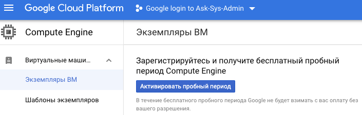 Попался мне не глаза такой документ от Google (GCP-FREE-TIER-USAGE-LIMIT) в котором сказано, что есть определенные лимиты за которые не взымается плата, посмотрел их планы и судя по всему сервер с минимально-необходимым набором "оборудования" и в определенном регионе вполне попадает под эту нотацию (лимиты на свободное использование), в общем сервер я создал, а там война план покажет. Где и как создавать сервер Первым делом, перед созданием обязательно прочтите нотацию по лимитам так как она периодически меняется, далее необходимо перейти в консоль GOOGLE CLOUD, в раздел "ЭКЗЕМПЛЯРЫ ВМ" Если не активировано - активировать (потребуется указать платежные данные, если уже есть GA, то достаточно будет дать согласие на его использование), далее создать машину: Создание сервера Со следующими параметрами (скин из нотации): После создания подключиться по SSH: И если необходимо разрешить доступ по HTTP/HTTPS в настройках экземпляра ВМ: Можно пользоваться (и не забывать следить за тратой денежны