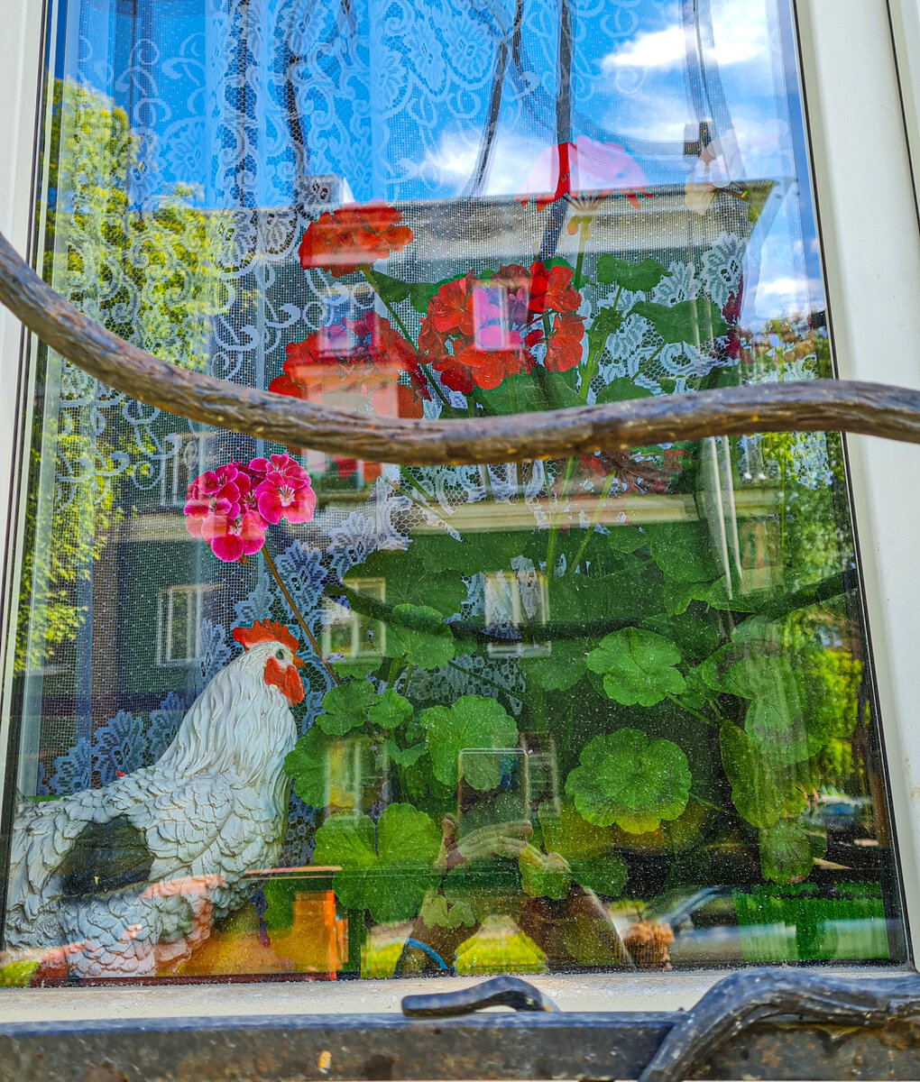 Конечно на фото не очень видно, но все же...Курочка, красная герань, ажурный тюль....Все очень уютно и мило.