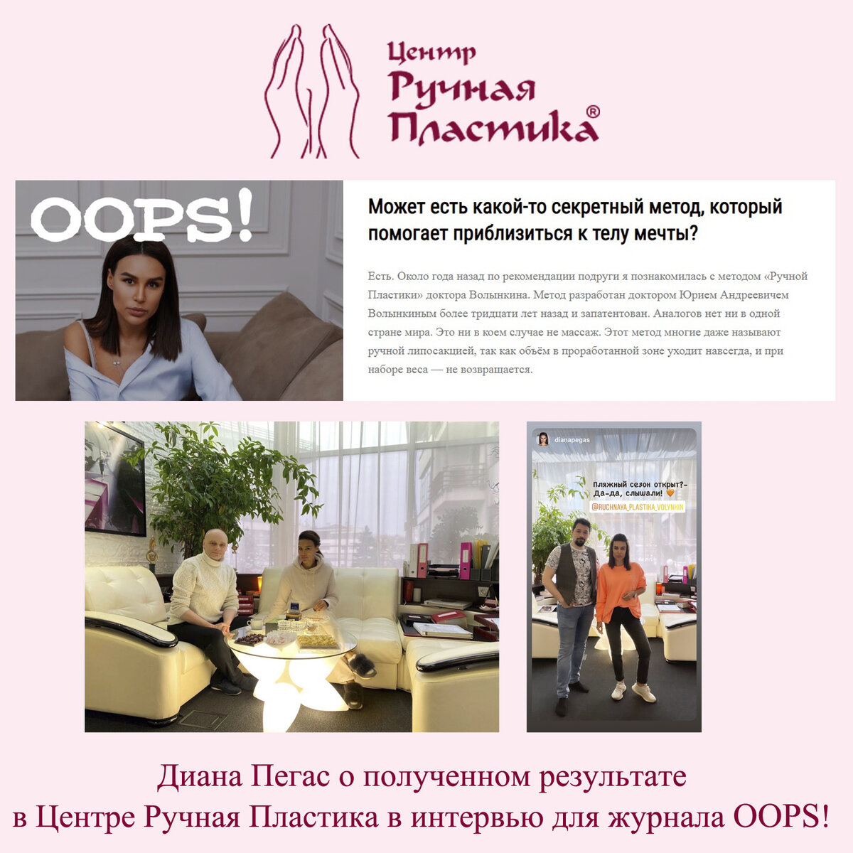 В журнале Oops! Вышло большое интервью нашей клиентки Дианы Пегас, где она упомянула и о Ручной Пластике доктора Волынкина. Может есть какой-то секретный метод, который помогает приблизиться к телу мечты? Есть. Около года назад по рекомендации подруги я познакомилась с методом «Ручной Пластики» доктора Волынкина. Метод разработан доктором Юрием Андреевичем Волынкиным более тридцати лет назад и запатентован. Аналогов нет ни в одной стране мира. Это ни в коем случае не массаж. Этот метод многие даже называют ручной липосакцией, так как объём в проработанной зоне уходит навсегда, и при наборе веса — не возвращается.
